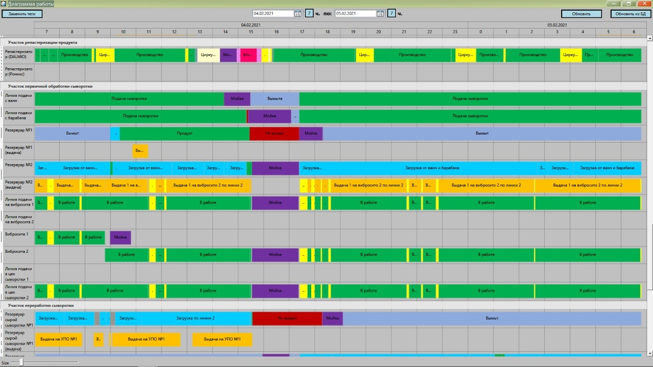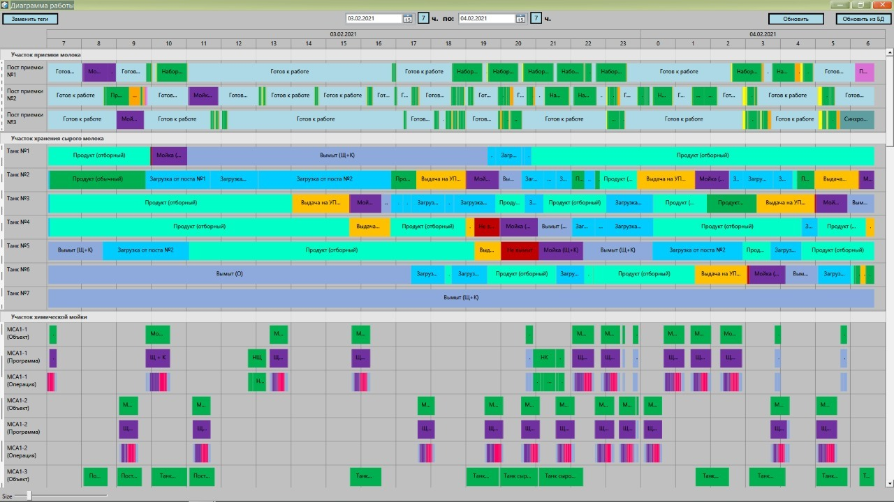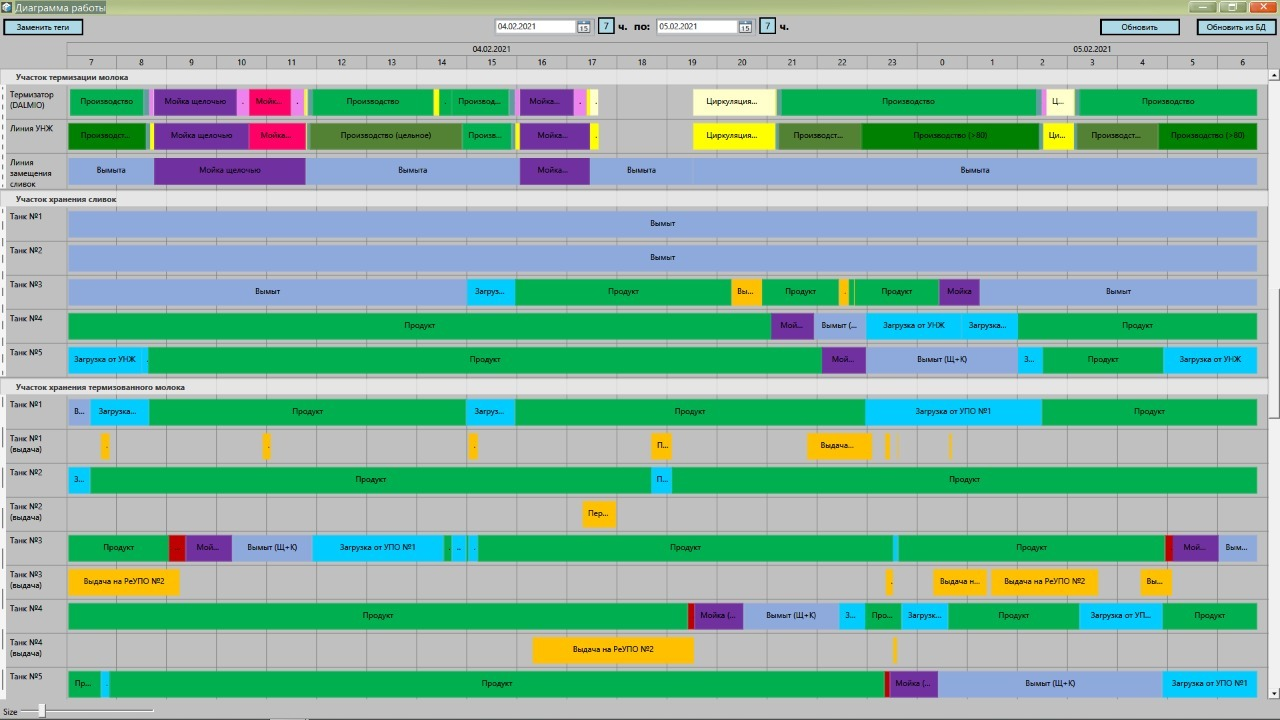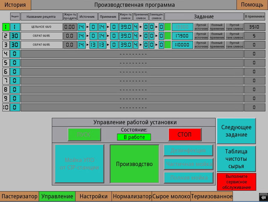 Управление участками ведется путем задания производственной программы из рецептов, включения маршрутов или задания очереди выполнения операций. Каждый участок стал максимально автоматизирован.
